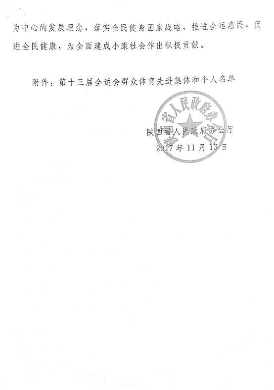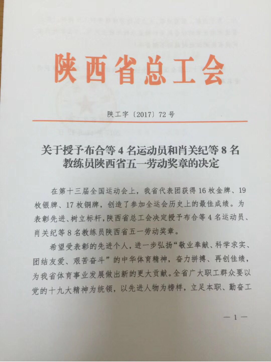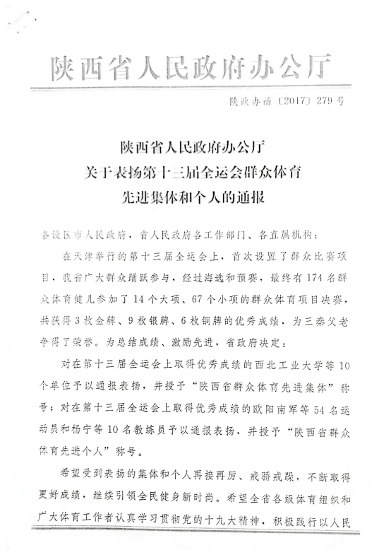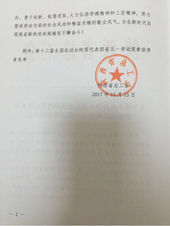 喜訊:陜西省人民政府辦公廳授予公司員工楊力驍陜西省群眾體育先進(jìn)個人 及陜西省總工會授予公司員工楊力驍陜西省五一勞動獎?wù)?/div>