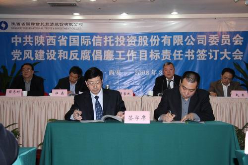 2008年3月31日,我公司在神州高速酒店唐廳召開了黨風(fēng)建設(shè)和反腐倡廉目標(biāo)責(zé)任書簽訂大會。公司黨委副書記、紀(jì)委書記黎惠民主持會議,并宣讀了《中共陜西省國際信托投資股份有限公司委員會2008年度黨風(fēng)建設(shè)和反腐倡廉工作要點(diǎn)》;公司黨委書記、董事長薛季民同志分別與各部門(單位)負(fù)責(zé)人簽訂《部門(單位)黨風(fēng)建設(shè)和反腐倡廉工作目標(biāo)責(zé)任書》。會議要求各部門(單位)會后開展一次廉潔從業(yè)教育,并組織員工認(rèn)真簽署《員工廉潔從業(yè)承諾書》。
