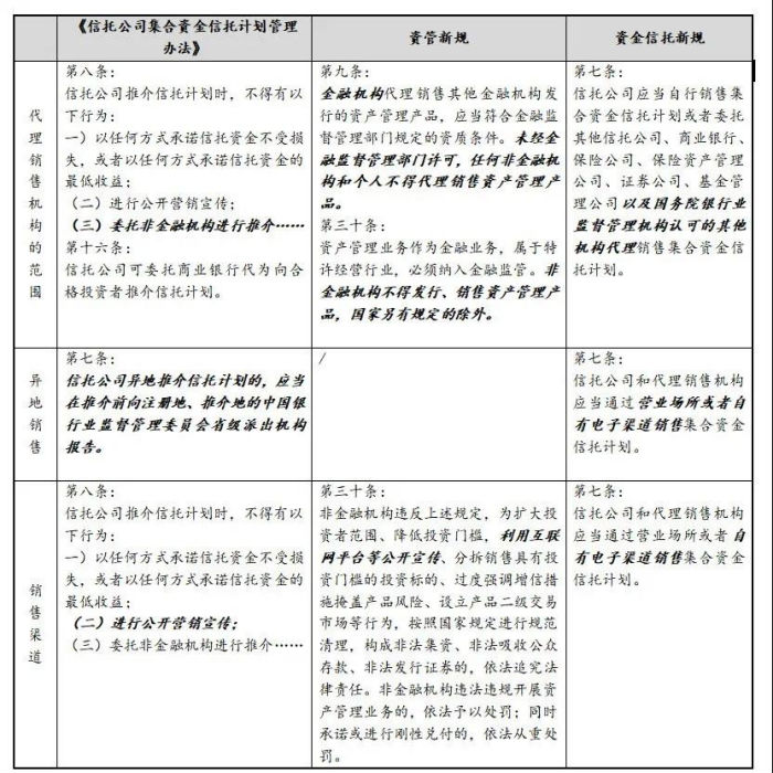 資金信托新規(guī)相對(duì)于資管新規(guī)及《信托公司集合資金信托計(jì)劃管理辦法》等規(guī)定,除再次強(qiáng)調(diào)“賣(mài)者盡責(zé),買(mǎi)者自負(fù)”,禁止剛兌的原則外,在資金信托推介及銷(xiāo)售上,主要有以下幾個(gè)方面的變化:1、留出委托非金融機(jī)構(gòu)推介的空間;2、未要求異地銷(xiāo)售事先報(bào)告;3、允許電子銷(xiāo)售渠道。