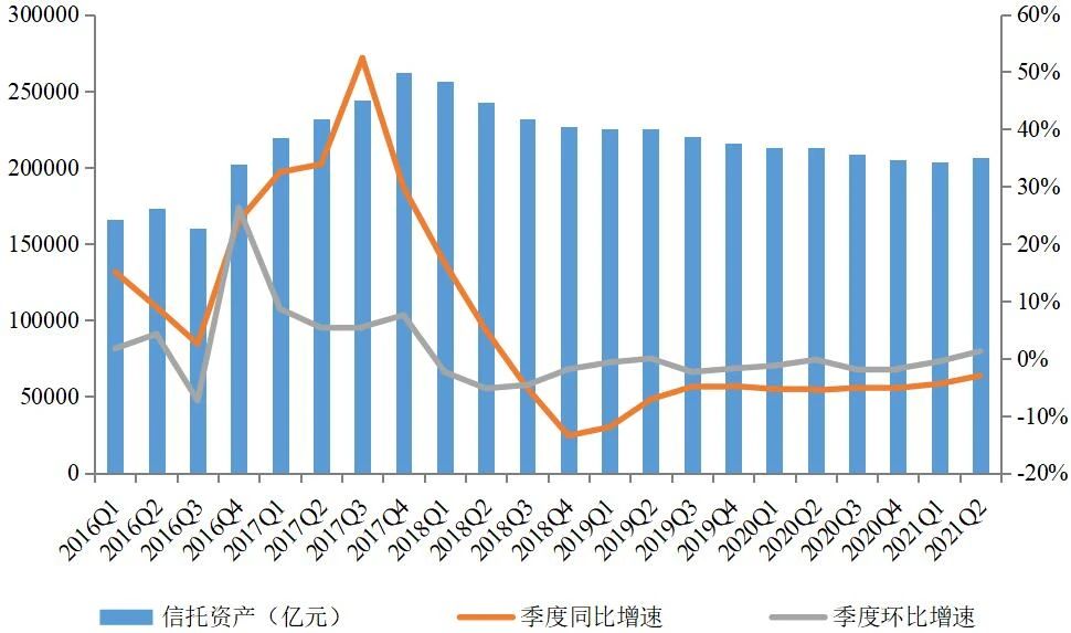 資管新規(guī)發(fā)布以來,信托業(yè)進入艱難轉型階段,信托資產(chǎn)規(guī)模從2017年4季度末的高點持續(xù)滑落。隨著資管新規(guī)過渡期臨近結束,信托資產(chǎn)規(guī)模漸趨平穩(wěn),并在2021年2季度首次出現(xiàn)回升。截至2021年2季度末,信托資產(chǎn)規(guī)模為20.64萬億元,與2020年2季度末相比,同比下降0.64萬億元,降幅為3.02%;與2021年1季度末相比,環(huán)比增加0.26萬億元,增幅為1.28%。