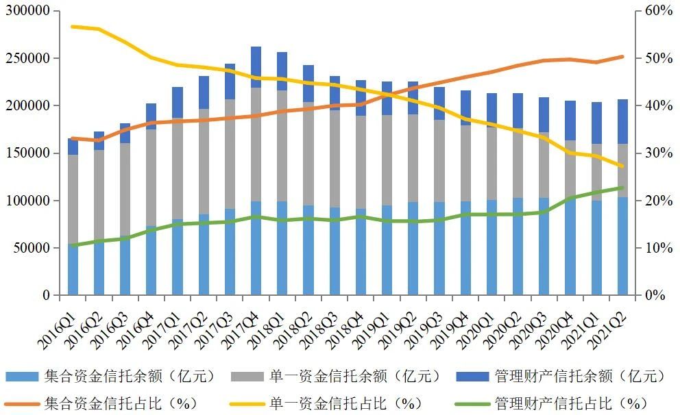 圖2 信托資產(chǎn)按資金來源分類的規(guī)模及其占比