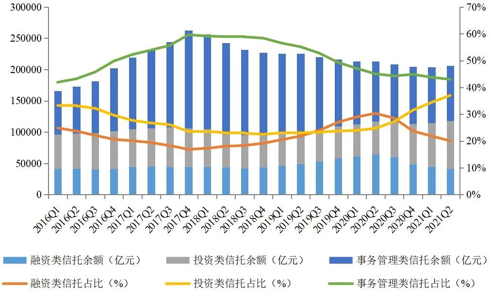 投資類信托是信托公司向主動管理轉型的重要領域。2020年2季度以來,投資類信托快速發(fā)展,規(guī)模迅速接近事務管理類信托。截至2021年2季度末,投資類信托規(guī)模增至7.64萬億元,同比大幅增長45.33%,環(huán)比增長8.96%;投資類信托占比升至37.00%,同比上升12.31個百分點,環(huán)比上升2.61個百分點。