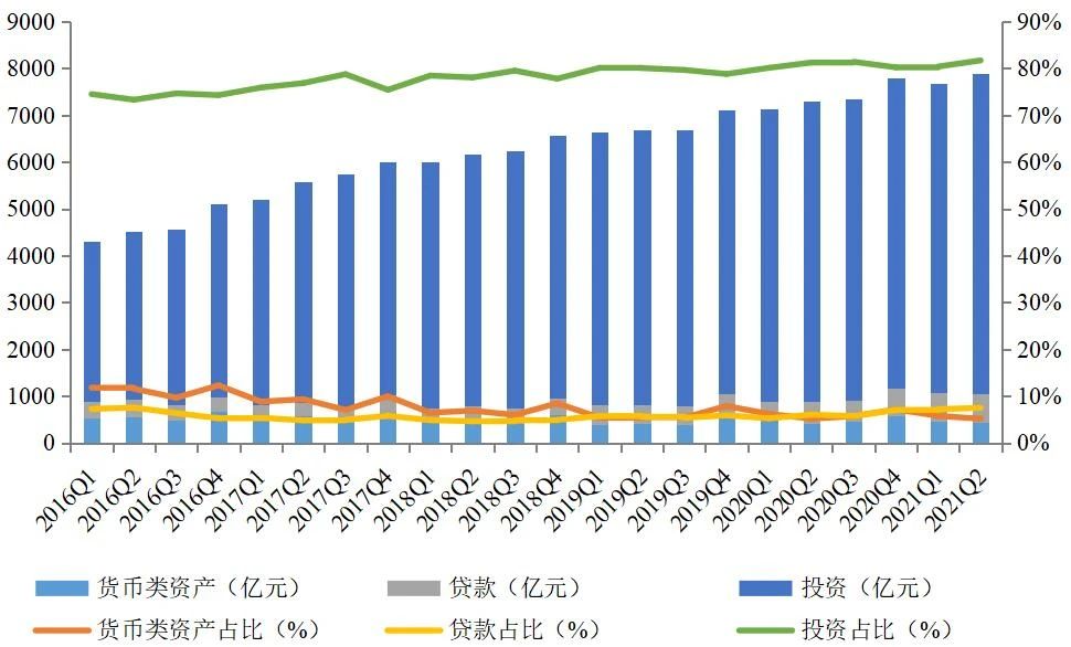 從固有資產(chǎn)的運用方式來看,投資始終占據(jù)最重要的地位,且規(guī)模和占比都維持整體上升的趨勢。截至2021年2季度末,投資規(guī)模為6824.61億元,同比增長6.45%,環(huán)比增長3.32%;投資占比為81.70%,同比上升0.46個百分點,環(huán)比上升1.30個百分點。貸款規(guī)模為625.90億元,同比大幅增長31.26%,環(huán)比增長5.54%;貸款占比為7.49%,同比上升1.45個百分點,環(huán)比上升0.27個百分點。貨幣類資產(chǎn)規(guī)模為431.76億元,同比增長5.37%,環(huán)比下降9.16%;貨幣類資產(chǎn)占比為5.17%,同比微降0.02個百分點,環(huán)比降低0.62個百分點。