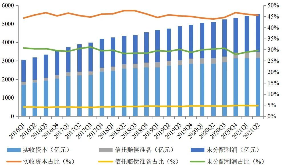 從所有者權益的構成來看,實收資本和信托賠償準備均出現(xiàn)較明顯的增長。截至2021年2季度末,實收資本為3153.99億元,同比增長10.78%,環(huán)比增長0.39%;實收資本占比為45.54%,同比上升1.69個百分點,環(huán)比降低0.48個百分點。