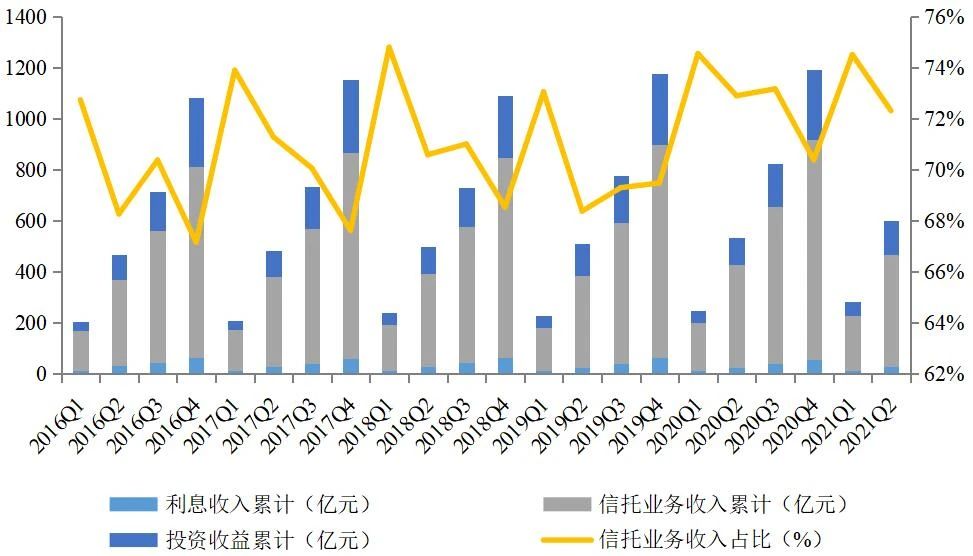 從收入結構來看,信托業(yè)務收入是信托公司最主要的收入來源,繼續(xù)保持良好的穩(wěn)定性。截至2021年2季度末,信托公司實現(xiàn)信托業(yè)務收入435.55億元,同比增長8.52%;信托業(yè)務收入占比為72.31%,同比降低0.59個百分點。