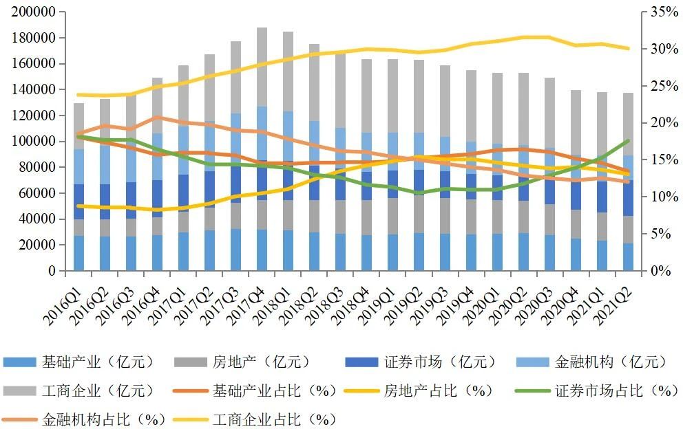 截至2021年2季度末,資金信托規(guī)模為15.97萬億元,同比下降9.56%。截至2021年2季度末,從資金信托在五大領域占比來看,排序分別是工商企業(yè)(30.00%)、證券市場(17.52%)、基礎產(chǎn)業(yè)(13.42%)、房地產(chǎn)業(yè)(13.01%)、金融機構(11.97%)。